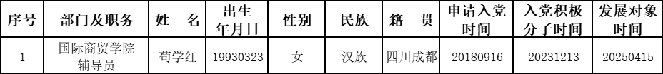 根据本人申请、组织培养,经国际商贸学院学生党支部研究,国际商贸学院党总支同意,拟吸收苟学红同志为中共预备党员,现将其有关情况予以公示。在公示期限内,欢迎广大党内、外群众通过信函、电话或直接反映等方式予以监督,以个人名义信函反映问题提倡署真实姓名。
