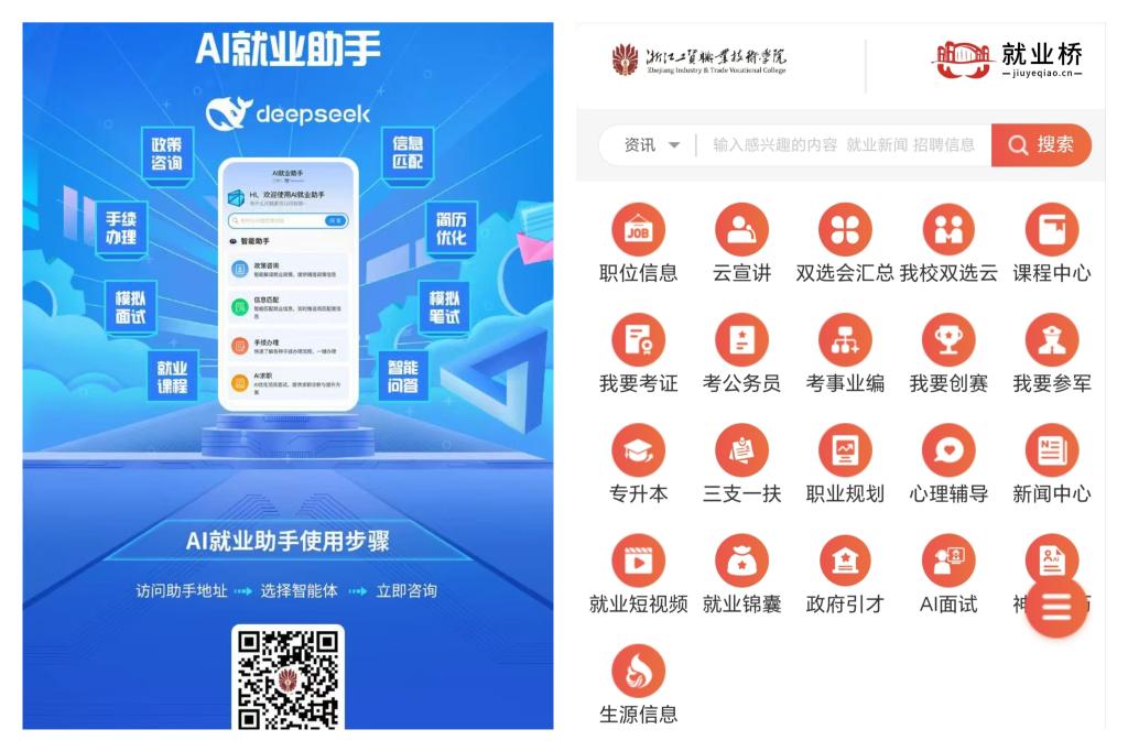 今年以来,为加强AI赋能学校毕业生就业服务,学校学生处(招生就业办)依托DeepSeek大模型技术,为学生提供全流程智能就业服务,kaiyun平台app下载上线“AI就业助手”,包含政策咨询、信息匹配、手续办理和AI求职等功能。同时,学校“招生就业服务微信公众号”新增“就业桥”板块,“就业桥”作为全方位、高质量、高精准的就业信息服务平台,涵盖“我要找工作”、“我要定制服务”和“我要考证”等模块。以上举措,大大方便我校学生及时了解、查询信息就业相关资讯、政策及职位信息。